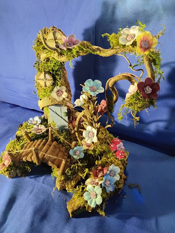 Diese Blumentür ist mit vielen Blumen verziert und aus gesammelten Hölzern und künstlichen Blumen zusammen gestellt. Lauf über die Brücke und klopfe an der Tür und schau wer Dir aufmacht.