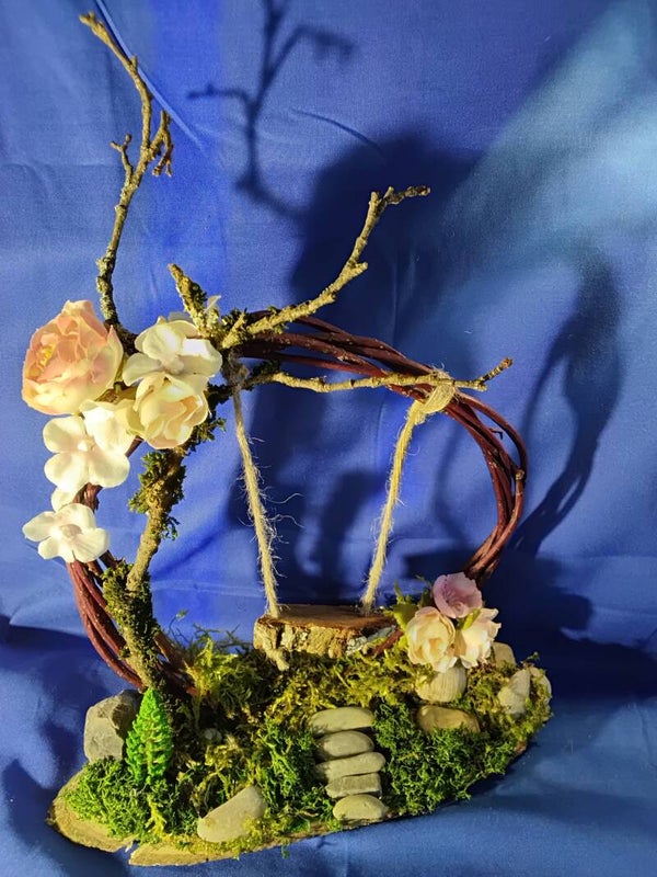 Diese zauberhafte Schaukel wurde aus Naturprodukten hergestellt und künstlichen Blumen. Sie ist ein kleines Stück aus dem Feenland.