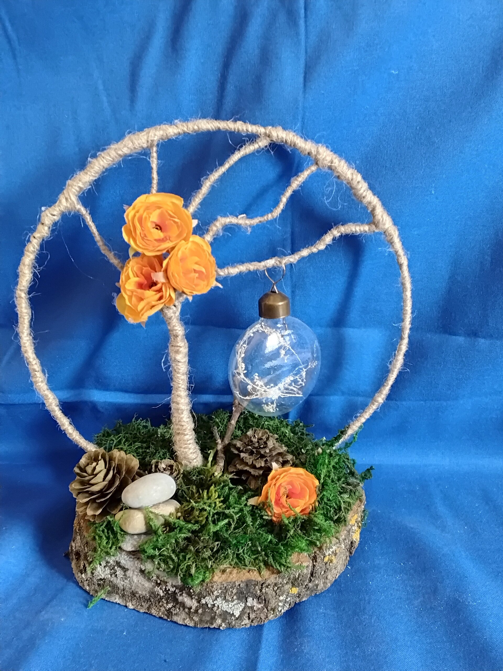 Der Baum des Lebens hab ich mit Draht selber gebogen und mit einer Kordel ummantelt. Alle Materialien sind teils aus der Natur gesammelt und dazu gekauft worden.